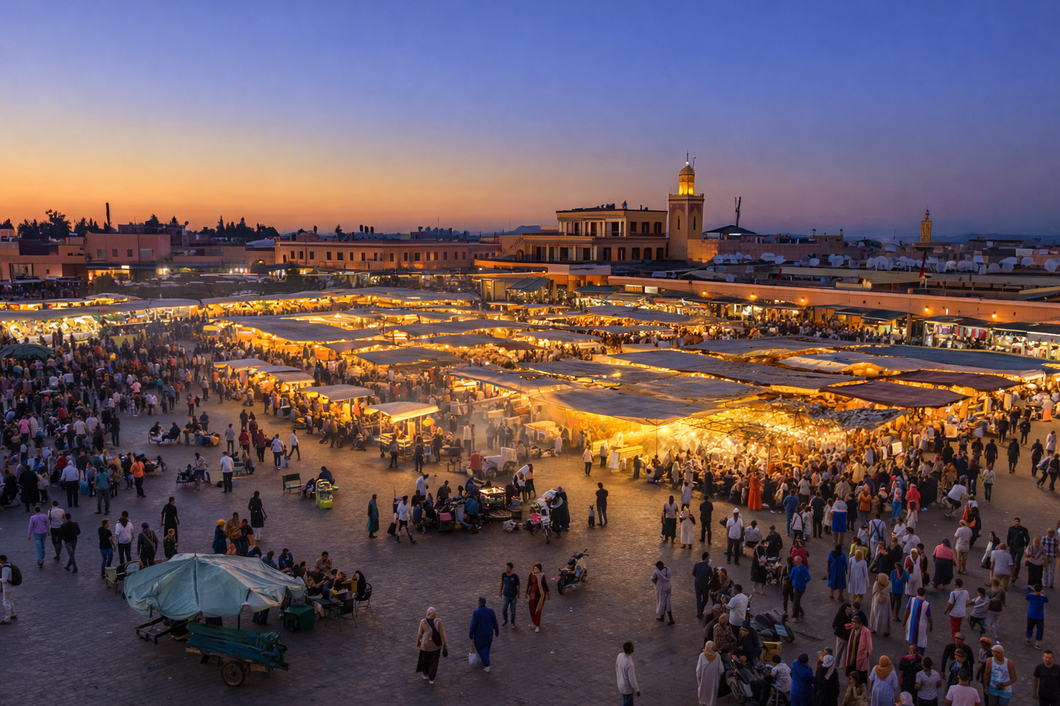 End the tour at Djemaa el-Fna, where you’ll witness the lively atmosphere of performers, storytellers, and food stalls.